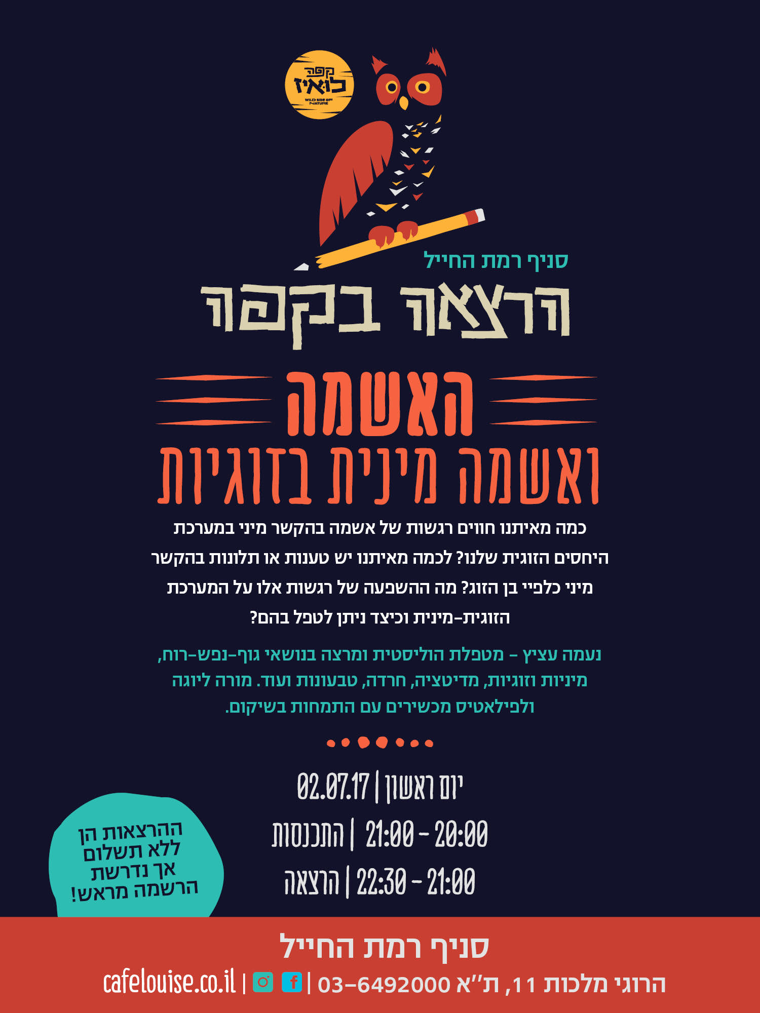 האשמה והאשמה מינית בזוגיות- הרצאה בקפה לואיז 2 ביולי 2017 על ידי גיל Leave a Comment מעלה מפה... קפה לואיז רמת החיילהרוגי מלכות 11 - תל אביבאירועים 32.109264 34.833401 תאריך/זמן Date(s) - 02/07/20178:00 pm - 10:30 pm מקום קפה לואיז רמת החייל קטגוריות ארועים של עסקים ברובע