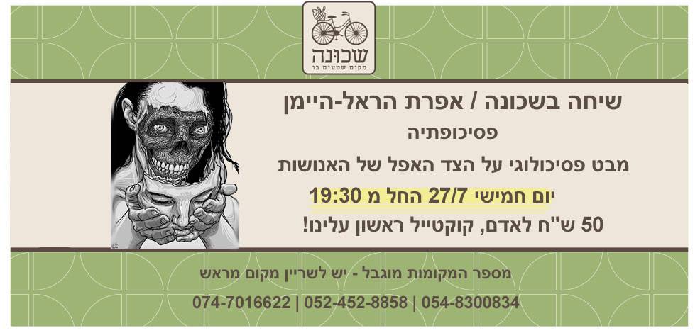 שיחה בשכונה- פסיכופתיה 27 ביולי 2017 על ידי גיל Leave a Comment מעלה מפה... השכונהאריה דיסנצ'יק 5 - תל אביבאירועים 32.116722 34.827057 תאריך/זמן Date(s) - 27/07/20177:30 pm - 10:00 pm מקום השכונה קטגוריות הרצאה קפה ומאפה