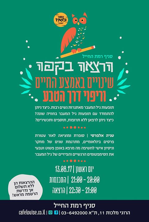 שינויים באמצע החיים וריפוי דרך הטבע – הרצאה בקפה לואיז 13 באוגוסט 2017 על ידי גיל Leave a Comment מעלה מפה... קפה לואיז רמת החיילהרוגי מלכות 11 - תל אביבאירועים 32.109264 34.833401 תאריך/זמן Date(s) - 13/08/20178:00 pm - 10:30 pm מקום קפה לואיז רמת החייל קטגוריות ארועים של עסקים ברובע הרצאה קפה ומאפה