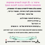 08/09/2015 @ 8:00 pm – 10:00 pm – אסנת פלג, הסטייליסטית המקסימה, ונועה לוי, מאפרת, מזמינות אתכן לערב חווייתי של איפור וסטיילינג. תקבלו בערב טיפים לאיפור ולסטיילינג, בקבוצה אינטימית (8-10 נשים), כיבוד קל ואווירה נעימה. עלות השתתפות- 120 ש"ח. יש להירשם מראש אצל אסנת (0528556770) או נועה (0544628421).