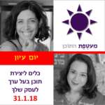 31/01/2018 @ 10:00 am – 2:00 pm – יום עיון ובו תלמדו לייצר תוכן בעל ערך לעסק שלכם. כל הפרטים על יום העיון, כאן.